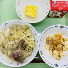 6月23日の給食 2021年6月23日 15時48分 6月23日(水)は第二次世界大戦の沖縄戦で亡くなった人々に祈りをささげる「沖縄慰霊の日」です。そんな今日の給食は、沖縄料理でした!・沖縄そば・タマナーチャンプルー・ティーダパイン・牛乳沖縄そばの上にはラフテーまでのっていました!